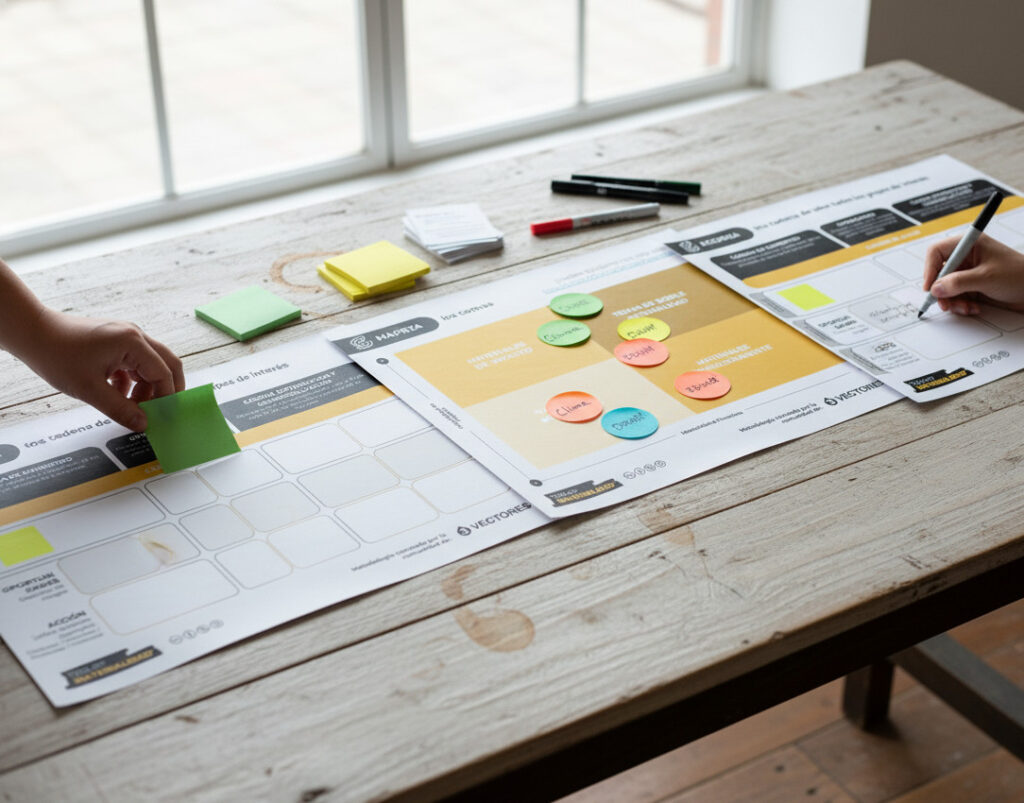 Incluye los 4 canvases en PDF tamaño A1 para imprimir, la planilla en Excel editable y la guía metodológica para aplicar el enfoque paso a paso.